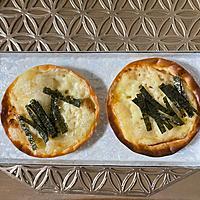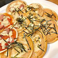 - 2 餃子の皮に1を塗り、ピザ用チーズを振りかけて250℃のオーブンでチーズにこんがりと焼き色がつくまで10分程焼いたら皿にのせ、最後にきざみのりを振りかければ完成です!