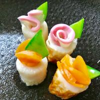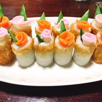 絹さやは予めゆでて冷ましておいて下さい。かまぼこの赤い部分を花びらに見える様に端からくるりと丸めましょう。ちくわを器にして、白い部分を入れ込むとお花の完成です。 にんじんの花は、少し重なる様に入れ込んでいくとバラの様になります。