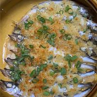 - 2 耐熱皿にししゃもを並べ、1をのせ、全体に広げます。