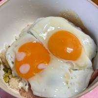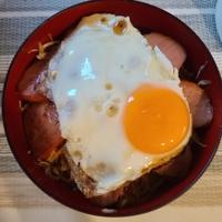 目玉焼きは2枚焼いたが焼き豚が見えなくなるので写真撮影時には1枚だけ乗せた。これも2枚は多くて1枚で十分だった。