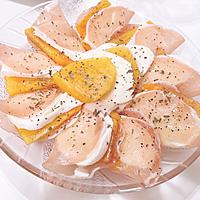 - 4 器に生ハムをひき、1、2を巻いて盛り付け、3をかけて、黒こしょうを散らしてバジルを添えたら、完成です。