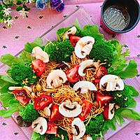 揚げ麺は太麺でもお作りいただけます。揚げ麺と野菜をよく混ぜ合わせてお召し上がりください。ドレッシングはお好きな物で代用できます。