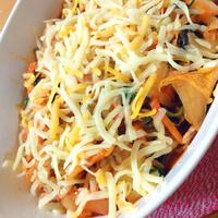 - 5 ピザ用チーズをのせてラップをかけ、豚バラ肉に火が通りチーズが溶けるまで再び600Wの電子レンジで3分加熱し、糸唐辛子をのせて完成です。