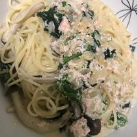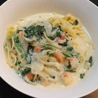 水菜→ほうれん草、豆乳→牛乳でしめじをとコンソメ追加、明太子を後入れにしてみました。簡単ですごくおいしいクリームパスタになりました!