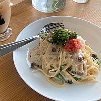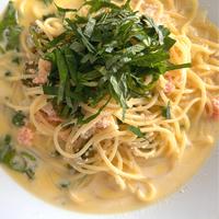 明太子クリームスパゲティのクリームを豆乳で作ります!牛乳や生クリームは使ってないのにまろやかな口当たりに。水菜や大葉のグリーンに明太子のレッド、そして豆乳のホワイトで色のコントラストもとって綺麗なパスタです。