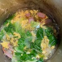 - 6 卵に火が通ったら1を入れて加熱し、サラダ菜がしんなりしたら火から下ろします。器に盛り付けてできあがりです。