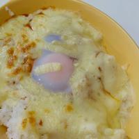 - 2 耐熱皿にごはんを敷き詰め、ゆで卵をのせ、1をかけ、ピザ用チーズを散らします。