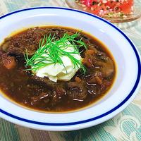 ブラウンマッシュルーム1パック追加、赤ワイン多め、煮込む際にローリエとホールクローブ投入、煮込んでからガストリックとウスターソースで調整。電気圧力鍋使用のため水無しで。サワークリームとディルを添えてバゲットと共にいただきましたが家族からも大好評でした。