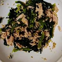 - 2 ボウルに塩昆布、(A)、1、ツナ油漬けを入れて和えます。