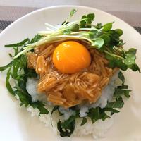 なめたけと大根おろしの卵かけごはんのご紹介です。甘塩っぱいなめたけに、大根おろしと卵黄を合わせることでさっぱりいただける卵かけごはんですよ。大葉の風味がとてもよいアクセントになっています。ぜひお試しくださいね。