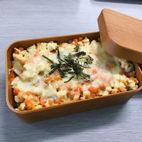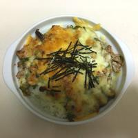 - 4 耐熱皿にごはんをよそい、3をかけ、ピザ用チーズをのせます。オーブントースターでチーズがとろけて焼き色がつくまで5分ほど加熱します。