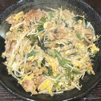 - 5 豚バラ肉の色が変わってきたら、 1、もやし、溶き卵を入れ中火で炒めます。