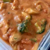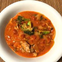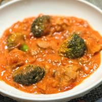 鶏もも肉とブロッコリーのトマトクリームシチューはいかがでしょうか。トマトの酸味は、加熱することで和らぎ、牛乳やクリームシチューのルー、有塩バターでコクが増し、鶏もも肉の旨味を感じる一品です。ぜひ、お試し下さい。