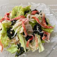 - 2 ボウルにレタス、韓国のりを手でちぎりながら入れ、1、カニカマを手で割きながら入れます。
