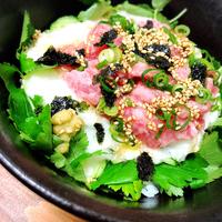 ねぎとろサラダ丼のご紹介です。マグロの旨味とシャキシャキの野菜の歯応えが、酸味の効いたごまだれとよく合います。更に長芋の食感も加わっておいしい一品に仕上がってます。お好みの野菜を入れて、ぜひお試しくださいね。