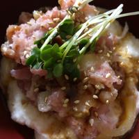 前日の残りのすき身があったので作ってみました。とろろとマグロってほんとによく合いますね。きゅうりの青い香りもいい感じです。水菜の代わりにスプラウト使用、大葉の千切りも混ぜました。
