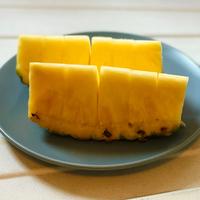 パイナップルの皮は固くて切りにくいので、包丁を扱う際は怪我をしないように、十分お気をつけてください。