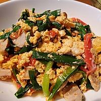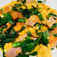 ベーコンはハムで代用し、ニラとトマトがレシピの分量より少なかったのですが、調味料はそのままで作りました。