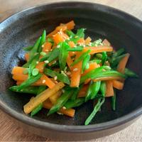 絹さやとにんじんをさっと茹でてナムルにしました。色合いがきれいなので、メイン料理の付け合わせにすると華やかですし、しっかりとした味付けなのでアルコールのお供としても合いますよ。ぜひ、お試しくださいね。