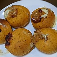 - 7 5を手のひらの上で10cmの円形に広げて6を包み、閉じ目を下にしてクッキングシートを敷いた天板に並べて、ラップと濡らした布巾をかけて、室温で30分発酵させます。(2次発酵)オーブンは180℃に予熱します。
