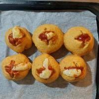 - 8 生地が1.5倍くらいの大きさになったら、上部に十文字の切り込みを入れ、切り口にピザソースをのせます。