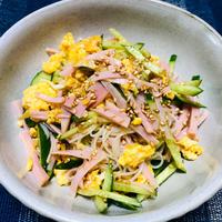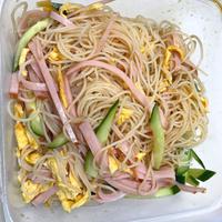 ビーフンを使った中華風サラダのご紹介です。春雨で作られることが多い中華風サラダですが、ビーフンでもおいしくいただけますよ。具材にはロースハムの代わりに、ゆで鶏もおすすめです。ちょっとした箸休めや、お酒のおつまみにも最適ですので、ぜひお試しください。