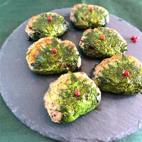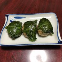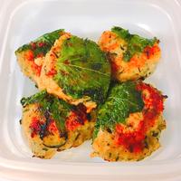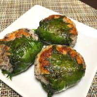 - 2 6等分に分けて丸く成形し、大葉で巻きます。