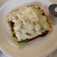 家族が多いので、餅の量を増やして大き目に作りました。ピーマンなく、ウインナー、ツナ、チーズをトッピング。ケチャップとニンニクソースがこれまた美味しい!普通のピザより好評!ただ難点はお餅を切るのに力がいること。