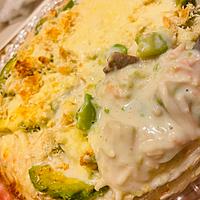 舞茸の代わりにマッシュルーム、コンソメの代わりにホタテだし使用。具材は一度フライパンに全て入れてホワイトソースと馴染ませてから器に移しました。