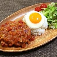 ハンバーグをトマトソースで煮込んで、ロコモコにしてみました。旨味たっぷりのハンバーグに、酸味のあるトマトソースがよく合います。お好みの野菜をたっぷり添えてサラダ仕立てにしても美味しく頂けます。是非お試しくださいね。