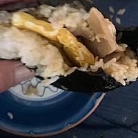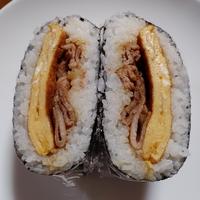 ご飯は1合の330g❔、お肉は100gは自分には多いと感じたので目分量で70gくらい、卵はどうせお肉を焼くので、その前に分量通りでフライパンで焼きました💡 大き過ぎて海苔の巻き方に悩んでおにぎらずにしちゃいました😅 美味しかったです😋