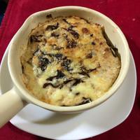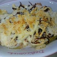 - 2 グラタン皿に長芋を並べ、ツナ油漬けを散らします。2を流し入れ、塩昆布、ピザ用チーズ、パン粉をのせ、トースターで10分程焼きます。中まで火が通り、焼き色がついたら、取り出します。