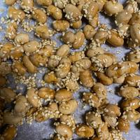 節分で残った福豆を使って甘じょっぱいおつまみを作りました。砂糖醤油を温めてからめ、白いりごまをかけるだけなので、とっても簡単です。ぜひ作ってみてください。残った福豆の量に合わせて、調味料は調節してくださいね。