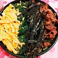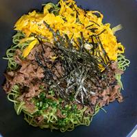 - 6 器に流水でほぐした5を平らに盛り付けます。1、4、のり、錦糸卵を乗せ、トッピングを飾り、2をかけて出来上がりです。