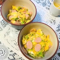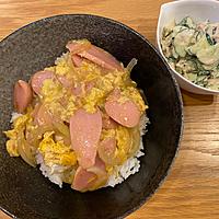 魚肉ソーセージの卵丼のご紹介です。魚肉ソーセージと玉ねぎをさっと炒めて卵とじにしごはんにのせました。ふわふわの卵と魚肉ソーセージ、シャキシャキとした食感の玉ねぎがとてもよく合いますよ。ぜひお試しください。
