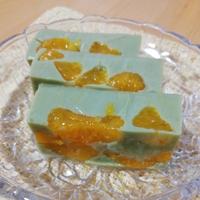 抹茶風味の牛乳寒天に、たっぷりのみかん缶を入れて冷やし固めました。甘くてジューシーなみかん缶をたっぷりと入れて作るので、しっかりとした寒天の食感とみかんの違った食感がお楽しみいただけますよ。ぜひお試しください。