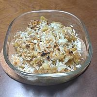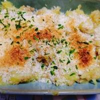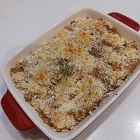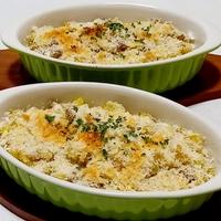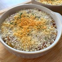- 5 3に4、ピザ用チーズ、塩こしょうを加えて混ぜ合わせます。耐熱皿に移し、パン粉をかけてオーブントースターで焼き色が付くまで8分程焼きます。