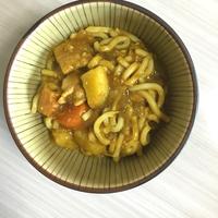 - 5 カレー粉の香りがたったら残りのカレースープの材料を入れて中火のまま煮込み、うどんを入れ、パッケージの表記通りに加熱し、無調整豆乳を入れます。