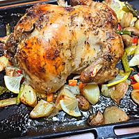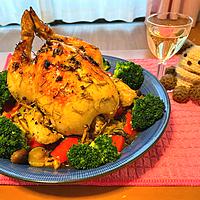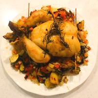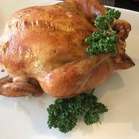2.4 キロの大きい丸鶏でしたので、ターキーのやきかたを参考にしました。220℃ でまず40分焼き、ジューシーにこんがりさせるために、190-200℃くらいに温度を落とし、チーズクロスをかけて20分ごとベーステイング(鶏から落ちる油をハケでとりにぬる)を何回かして、合計2時間くらいで焼けました。とてもジューシーで本当に大好評で、4人で食べきりました。ガラは水からから2-3時間煮込みストックスープをとり、翌日はチキンスープにしました。今回は時短のためスタッフィングはしませんでした