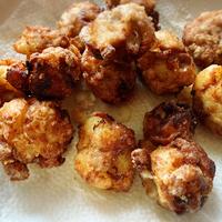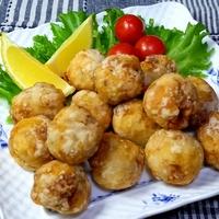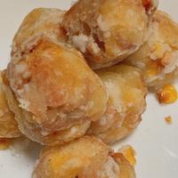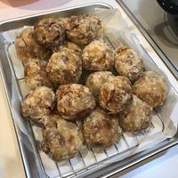 片栗粉まぶしてからも手の平で軽く転がしてから揚げると丸っこくミートボールサイズ。