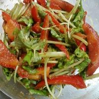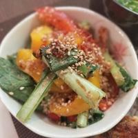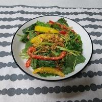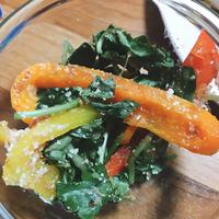 パプリカは赤と黄色を半分ずつ、レンジで加熱した小松菜で作りました。自分では考え付かない味付けで新鮮で美味しかったです。ご馳走さまでした、ありがとうございました。