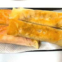 - 7 春巻きの皮を半分に切ったら、上に5をのせてチーズを置き(C)を糊付けにして細く巻きます。