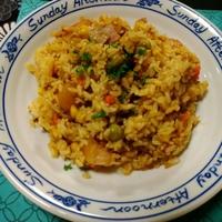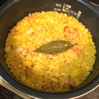 炊いてから時間がたったので色が悪い新米だったので少し柔らかくなりました。ウインナーなかったのでハムで家にあったミックスベジタブルは玉ねぎ入りだったので玉ねぎは別に加えず後は全て半分の量で炊きました。カレー粉が多い気がしましたが炊きあがってから混ぜるといい具合にカレーピラフになってました。簡単でおいしいです!