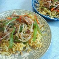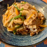 私も家にある材料で。汁気が少なかったですが、麺は焼きそばの麺を多めの油で表面をカリカリに焼いたものにしたので違和感なかったです。