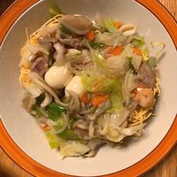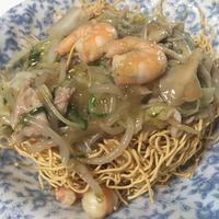 - 5 水溶き片栗粉でトロみをつけ、かた焼きそばにかけたら完成です。