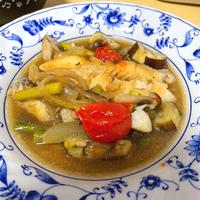 切り身のいさきで作りました。野菜に埋もれてますがいつものアクアパッツァと違いまた和風なので食べても太らないと錯覚するくらい美味しく頂きました♪🎶