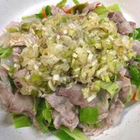 - 7 5の豚もも肉に火が通ったら6をかけて出来上がりです。