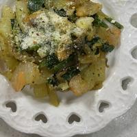シーフードとじゃがいもの組み合わせが絶妙で、爽やかなバジルの香りが食欲をそそります。じゃがいもは電子レンジで下茹でしておくとホクホクに仕上がり、時短にもなるポイントです。バジルは生でもジェノベーゼソースでも美味しく、フレッシュな香りが楽しめます。鶏むね肉やパプリカ、ピーマンを加えてアレンジするのもおすすめ。手軽に作れて、おかずにもおつまみにも最適な一品です。