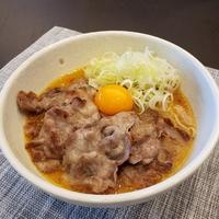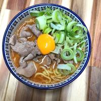 市販の袋麺の味噌スープに豆板醤とすりゴマを入れました。しゃぶしゃぶ用の薄い肉を使ったのでかなり縮みましたが、香ばしく焼けてすごく美味しかったです❗ リピります😁