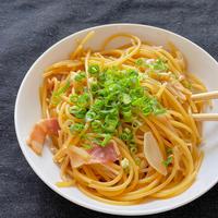 - 5 水分が少なくなり、スパゲティに火が通ったら火から下ろします。お皿に盛り、小ねぎを散らして完成です。